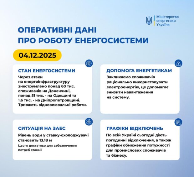 ПідписатисяСтаном на ранок 4 грудня відключення торкнулися понад 60 000 споживачів у Донецькій області, понад 51 000 на Одещині та близько 1600 на Дніпропетровщині. Ремонтні бригади продовжують аварійні роботи, працюючи без зупинки, щоб якнайшвидше відновити електропостачання.