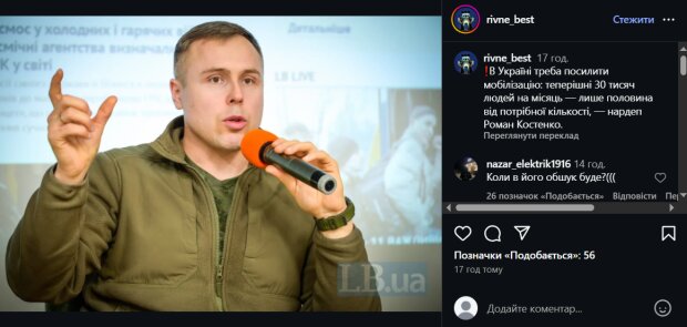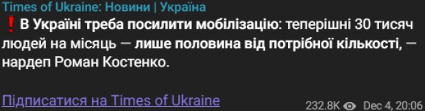 «В Україні треба посилити мобілізацію: теперішні 30 тисяч людей на місяць — лише половина від потрібної кількості, — нардеп Роман Костенко», - йдеться у повідомленні.