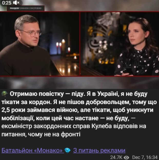 «Отримаю повістку — піду. Я в Україні, я не буду тікати за кордон. Я не пішов добровольцем, тому що 2,5 роки займався війною, але тікати, щоб уникнути мобілізації, коли цей час настане — не буду, — ексміністр закордонних справ Кулеба відповів на питання, чому не на фронті», - йдеться у повідомленні.