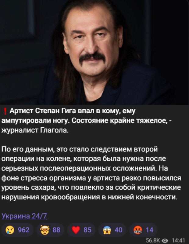 Окрім цього, в мережі вже можна бачити дуже багато публікацій, що Степан Гіга перебуває у комі та йому ампутували ногу.
