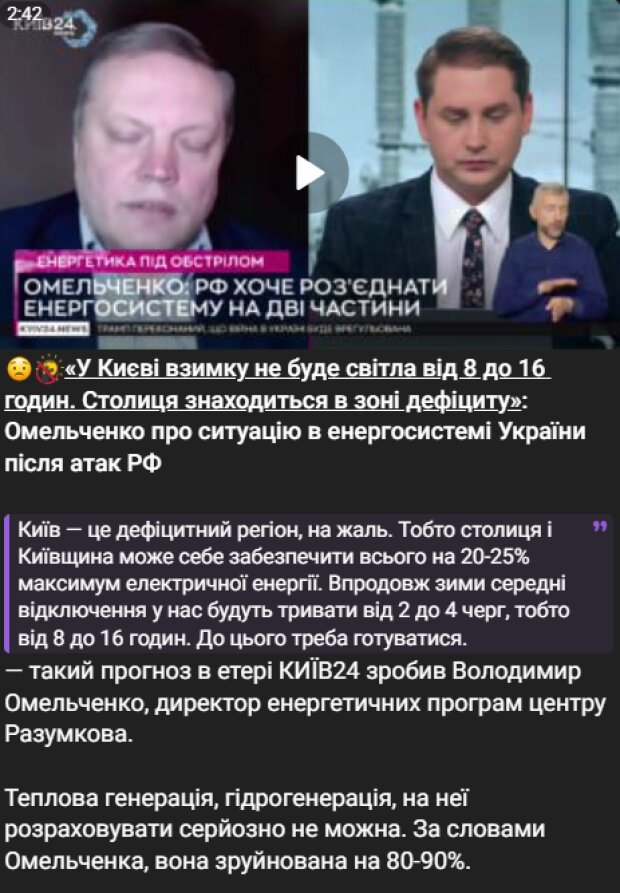 ПідписатисяЗа поточними оцінками, столиця здатна покрити лише близько чверті свого необхідного споживання електроенергії, що ставить її у зону стійкого дефіциту, як попереджає Володимир Омельченко, директор енергетичних програм центру Разумкова.