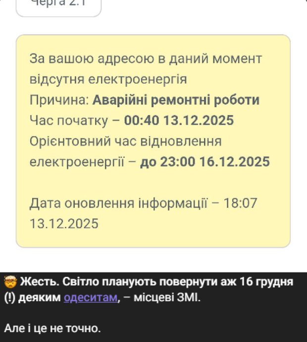 Водночас у деяких районах Одеси також дуже сумна ситуація. Місцеві ЗМІ повідомляють, що енергетичні компанії планують відновити електропостачання для деяких мешканців аж 16 грудня, якщо не виникне подальших ускладнень.