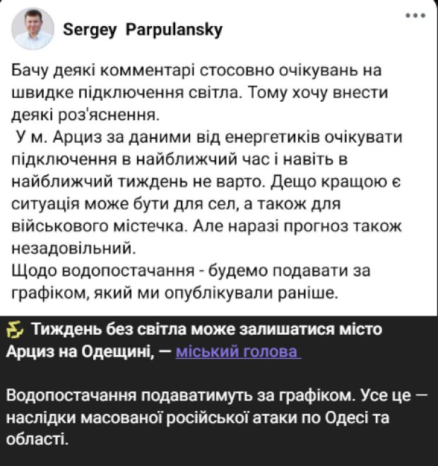 «Від енергетиків очікувати підключення в найближчий час і навіть в найближчий тиждень не варто», - попередив Сергій Парпуланський.