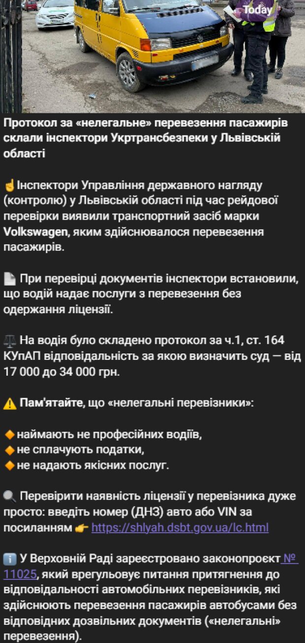 Під час нещодавньої перевірки у Львівській області співробітники Державного наглядового управління виявили автомобіль Volkswagen, який використовується для пасажирських перевезень без належної ліцензії.