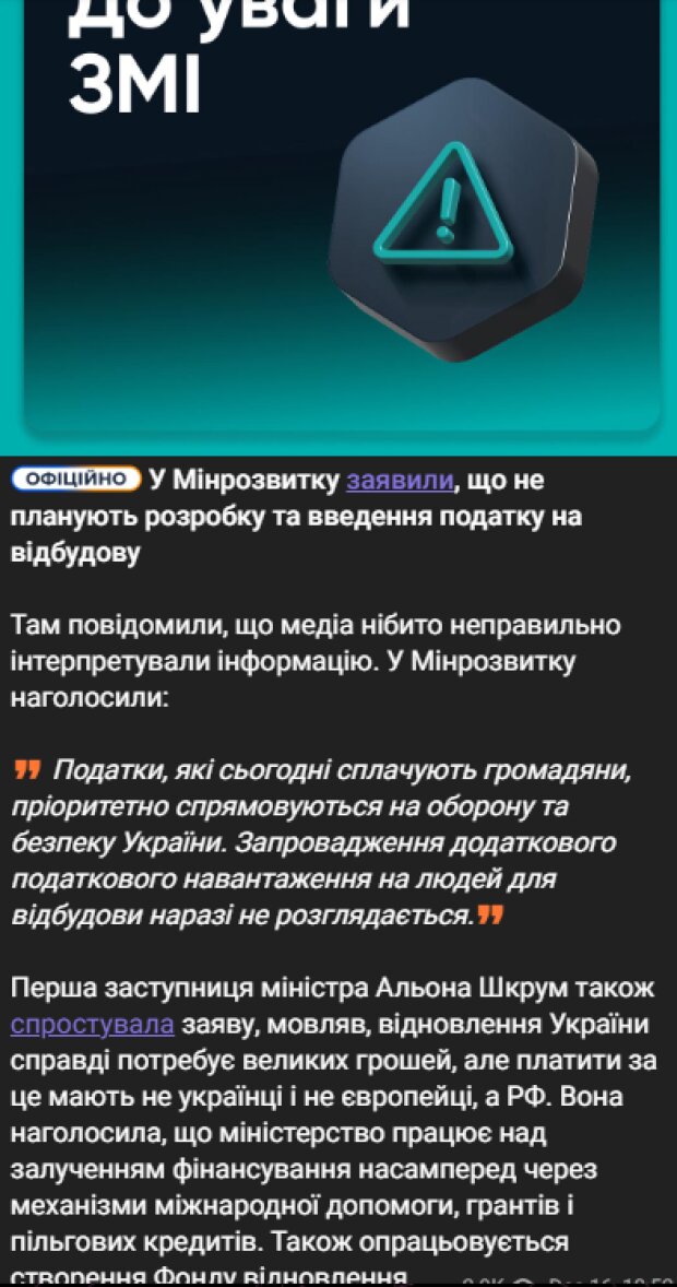 Міністерство розвитку та інфраструктури підтвердило, що планів щодо запровадження спеціального податку на відновлення України немає. Чиновники підкреслили, що нещодавні повідомлення у ЗМІ, які передбачають протилежне, ґрунтуються на неправильному тлумаченні.