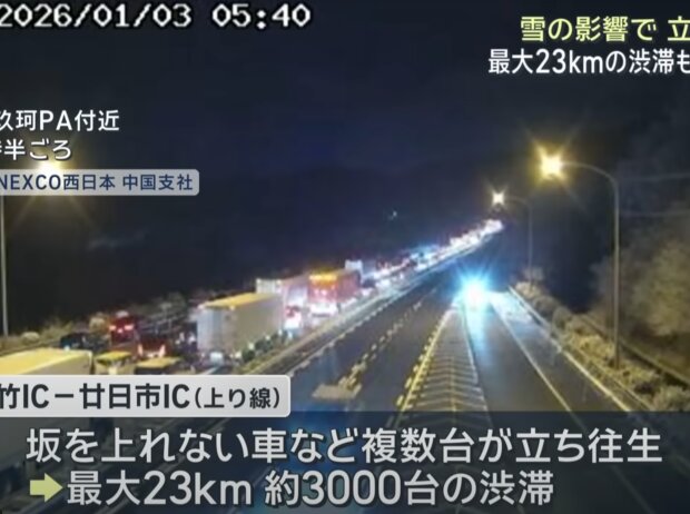 На заході Японії через несподіваний аномальний снігопад на швидкісній магістралі між префектурами Хіросіма та Ямагучі утворився справжній “сніговий кошмар” – затор протяжністю 23 кілометри.