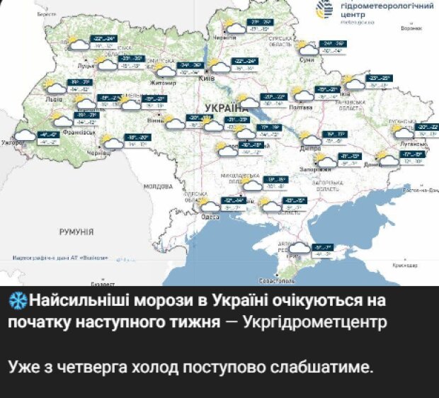 Укргідрометцентр у свою чергу попереджає, що найсильніші морози очікуються на початку тижня. Арктичні повітряні маси продовжуватимуть підтримувати низькі температури по всій країні.