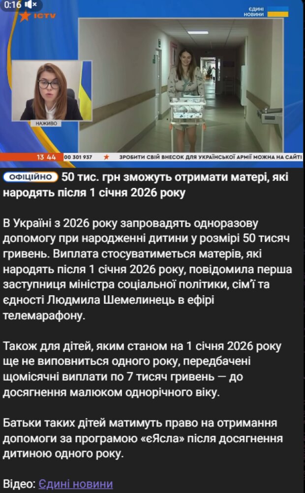 Первый заместитель министра социальной политики, семьи и единства Людмила Шемелинец в эфире телемарафона сообщила, что помимо единовременной выплаты, правительство также запланировало ежемесячную поддержку младенцам, родившимся до конца 2025 года, которым по состоянию на 1 января 2026 года не исполнится один год. Их родители смогут получать по 7000 гривен ежемесячно до достижения ребенком одного года.