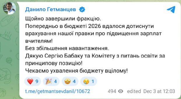 Проект государственного бюджета на 2026 год включает запланированное повышение заработной платы учителей, что подтвердил председатель парламентского комитета по финансам Данило Гетманцев.