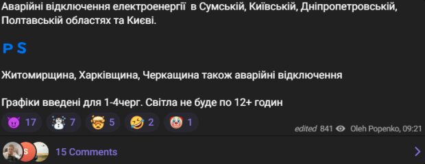 Олег Попенко, засновник громадської організації «Союз споживачів комунальних послуг» та колишній радник заступника голови Київської міської державної адміністрації, повідомив, що наразі у кількох регіонах України спостерігаються масштабні аварійні відключення електроенергії.